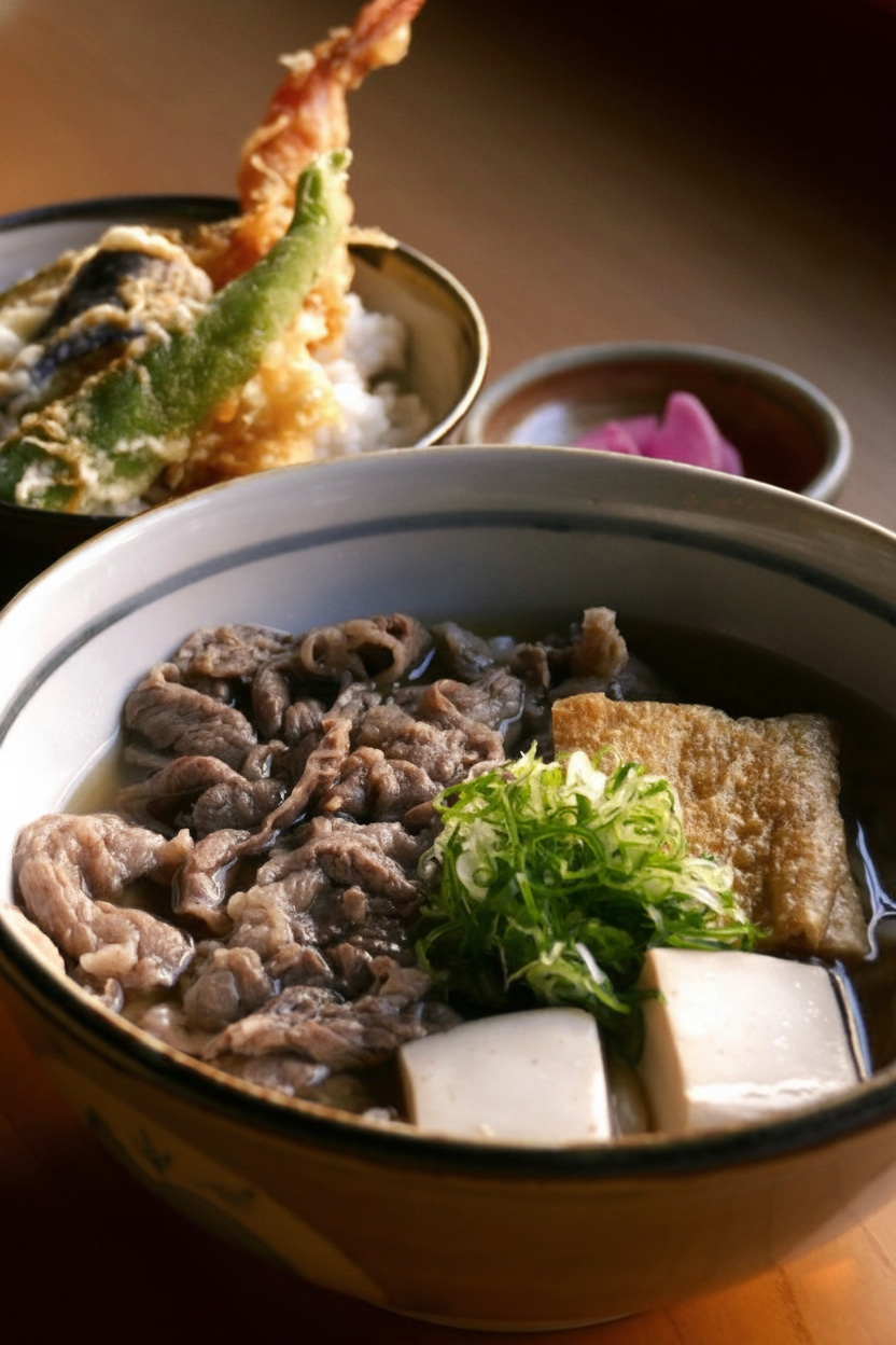 本日より、新メニュー 「和牛・肉豆腐うどんと京天丼」の販売を開始いたしました。